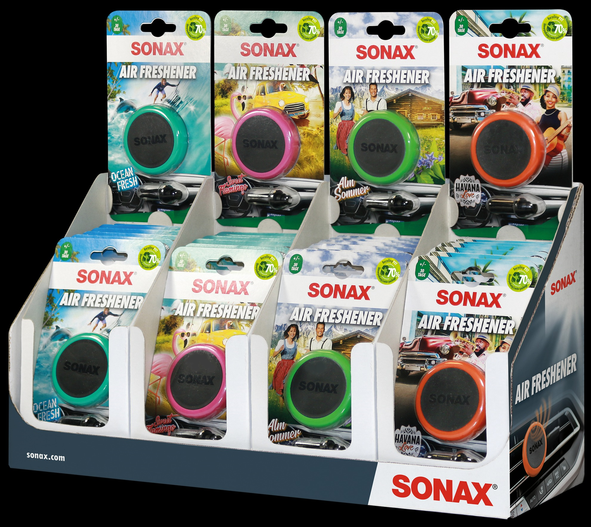 Sonax gaisa atsvaidzinātāja komplekts. Ienes transportlīdzekļa salonā svaigu aromātu. Nodrošina intensīvu, ilgstošu smaržu, izmantojot augstas kvalitātes smaržu eļļas. Viegli piestiprināms pie ventilācijas restes. Saturs: 6 gaisa atsvaidzinātāji no katra aromāta: AlmSommer , Sweet Flamingo, Ocean fresh and Havana Love.
