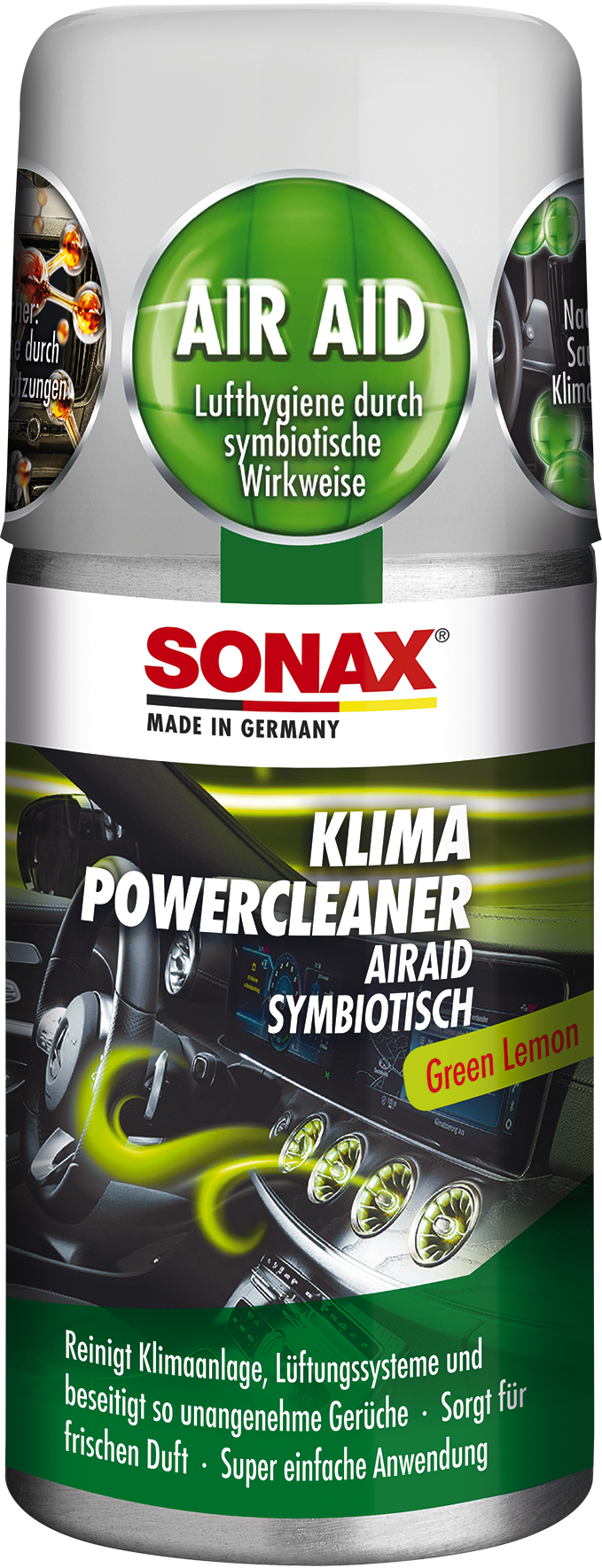 SONAX A/C tīrītājs ar zaļa citrona smaržu. Probiotisks Gaisa kondicioniera tīrītājs ātri un viegli attīra kondicioniera bloku, ventilācijas sistēmu, novērš nepatīkamas smakas un rada svaigu aromātu interjerā. Lietošana ļoti vienkārša un ātra, pēc 15 minūtēm darbībā, var izvēdināt auto un to lietot.