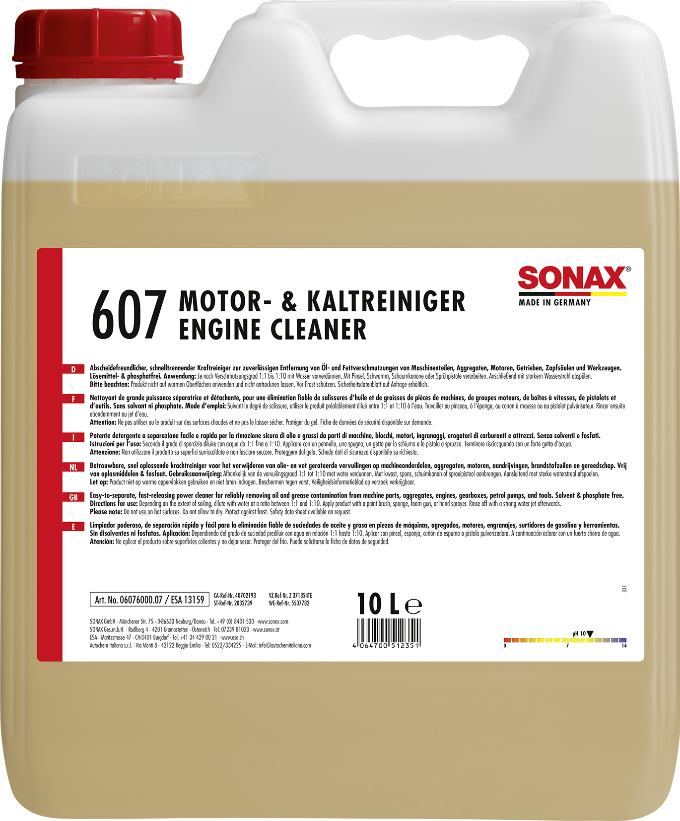 SONAX Motora tīrīšanas līdzeklis. Izcili notīra eļļas un tauku nogulsnes no mašīnas un montāžas daļām, dzinējiem, benzīna sūkņiem, instrumentiem un darbnīcu grīdām. Var lietot koncentrētu vai atšķaidītu. Bez šķīdinātāja un fosfāta.