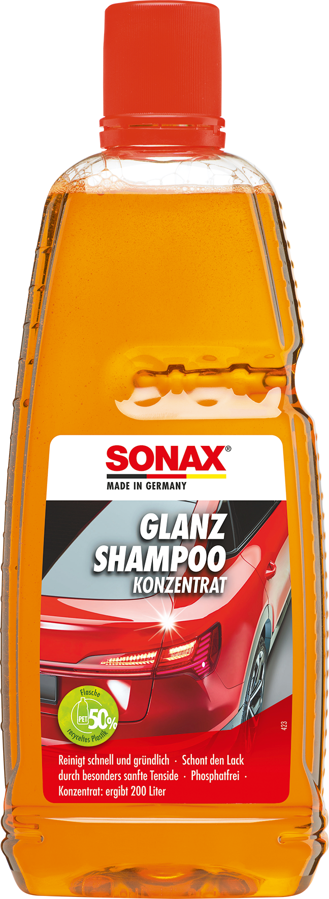 SONAX Šampūna koncentrāts – spīdumam. Ar ļoti spēcīgu tīrīšanas jaudu, iekļūst un izšķīdina netīrumus, nebojājot aizsargājošo vaska slāni uz krāsojuma. Tīra visas krāsas, gumijas, plastmasas, vinila un stikla virsmas. Īpaši saudzējošas virsmaktīvās vielas ir saudzīgas pret krāsojumu. Nesatur fosfātus un ir pH neitrāls. Dermataloģiski pārbaudīts, nekaitīgs, automašīnas mazgāšanai ar rokām.