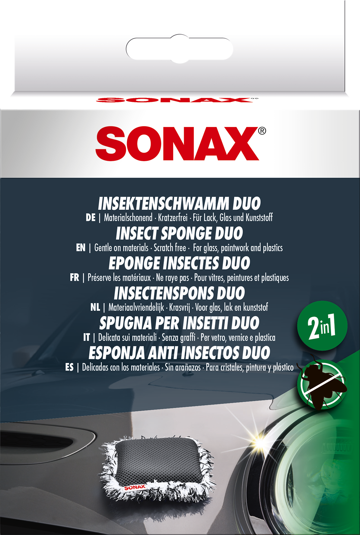 SONAX Insektu noņemšanas sūklis. Viegli , ātri un bez skrāpējumiem noņem kukaiņu paliekas, putnu izkārnījumus un citus noturīgus netīrumus. Visām transportlīdzekļa virsmām, piemēram: krāsa , stikls un plastmasa. Izmantojiet sieta struktūru, lai viegli un vienkārši noņemtu no stikla un plastmasas. Lai maigi apstrādātu jutīgas krāsotas virsmas, strādājiet ar mikrošķiedras virsmu. Var mazgāt veļasmašīnā 40c