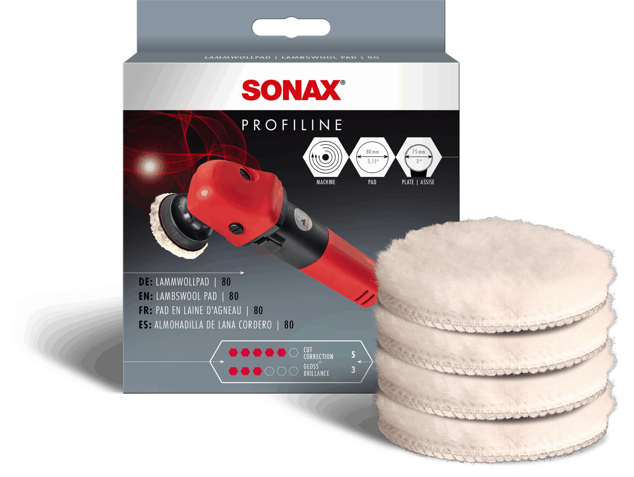 SONAX Vilnas ripa. Blīva, augstas kvalitātes ripa no dabīgas vilnas (diametrs 80 mm) automašīnas krāsas pulēšanai, izmantojot rotējošās pulēšanas mašīnas ar 75 mm pamatni. Ideāli piemērots darbam ar PROFILINE SP 06-02, PROFILINE Ultimate Cut un PROFILINE CutMax.