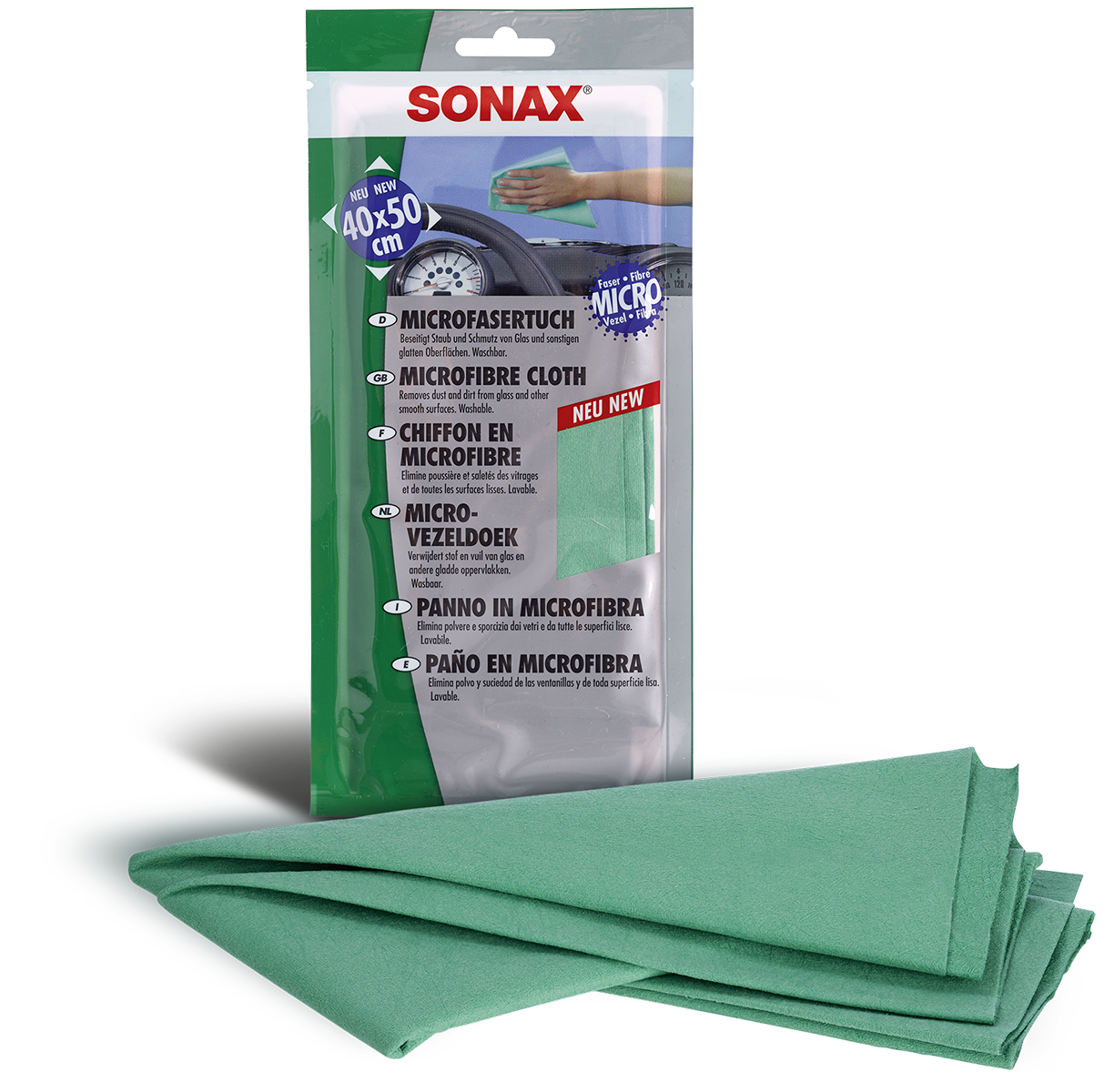 SONAX Mikrošķiedra visām gludām virsmām. Mikrošķiedras audums savāc putekļus, netīrumus un tauku atlikumus un notīra stiklu un visas pārējās gludās virsmas. Piemīt antistatiska iedarbība un nepūkojas. Mazgājams.