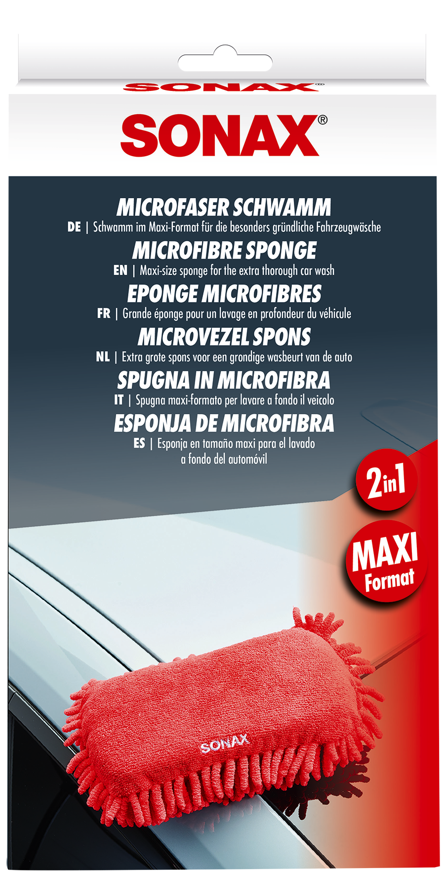 SONAX Mikrošķiedras švamme. Īpaši liela rūpīgai automašīnas mazgāšanai. Ar divām dažādām virsmām. Garās šenila šķiedras ir ļoti absorbējošas, tur daudz ūdens un patiešām saputo šampūnu. Gludā puse atvieglo noturīgu netīrumu, piemēram, kukaiņu nogulšņu noņemšanu.