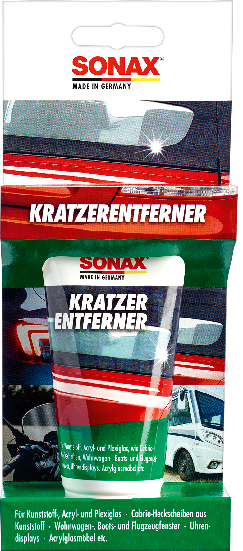 SONAX Plastmasas skrāpējumu noņēmējs. Līdzeklis noņem skrāpējumus un necaurredzamos plankumus no plastmasas, kabrioletu aizmugurējiem logiem , laivu un lidmašīnu logiem, mobilā tālruņa un pulksteņu displejiem, akrila stikla mēbelēm uc.