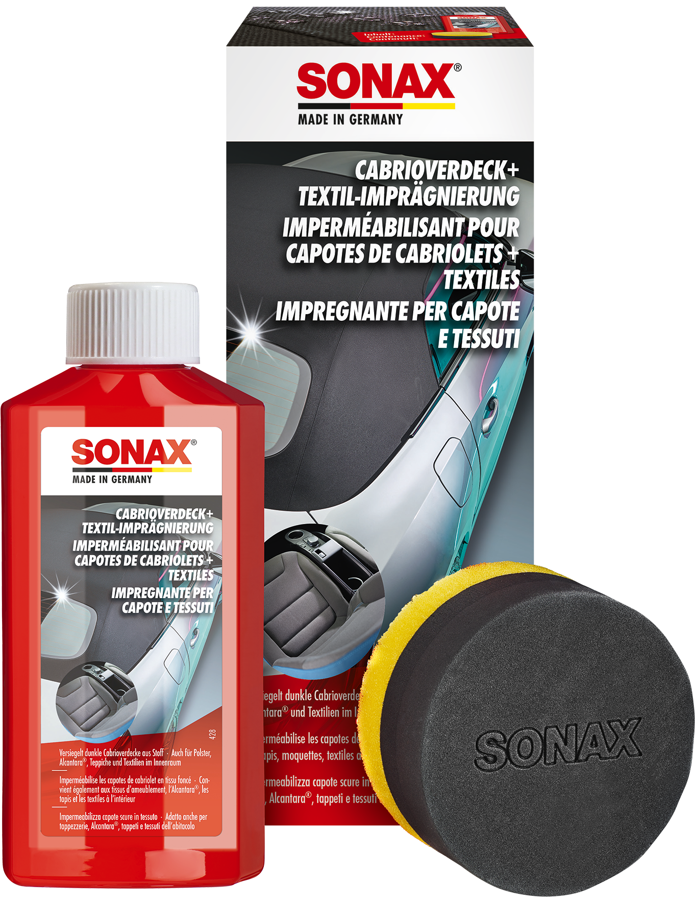 SONAX Mīksto jumtu un auduma ūdens adgrūšanas līdzeklis. Atgrūž ūdeni, mitrumu un atveiglo tīrīšanu kabrioletu jumtiem un audumam. Atjauno krāsas un aizsargā pret atkārtotu nosmērēšanu. Aizsargā un hidroizolē arī interjera tekstilizstrādājumus. Novērš netīrumu un mitruma iekļūšanu tekstilizstrādājumos un Alcantara sēdekļu pārvalkos, paklājos. Caurspīdīgs – piemērots visām krāsām. Komplektā ar praktisko putu dozatoru un aplikatoru tīrai un vienmērīgai uzklāšanai. Nelietot uz ādas!