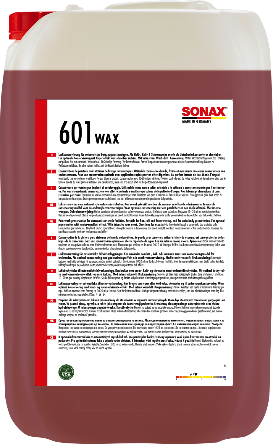 SONAX Auto vaska koncentrāts. Piemērots lietošanai kā karstais vasks, auksts vasks, putu vasks un kā auto apakšas pārklājums. Optimālai krāsu saglabāšanai automātiskajās mazgāšanas iekārtās ar karstā vaska sistēmām. Augsta atspīduma aizsargplēve ātri pārklāj visu transportlīdzekļa virsmu, lai nodrošinātu perfektu visaptverošu aizsardzību un ūdens atgrūšanas efektu. Atvieglo žāvēšanu. Lietot atšķaidītu. Ph 5.
