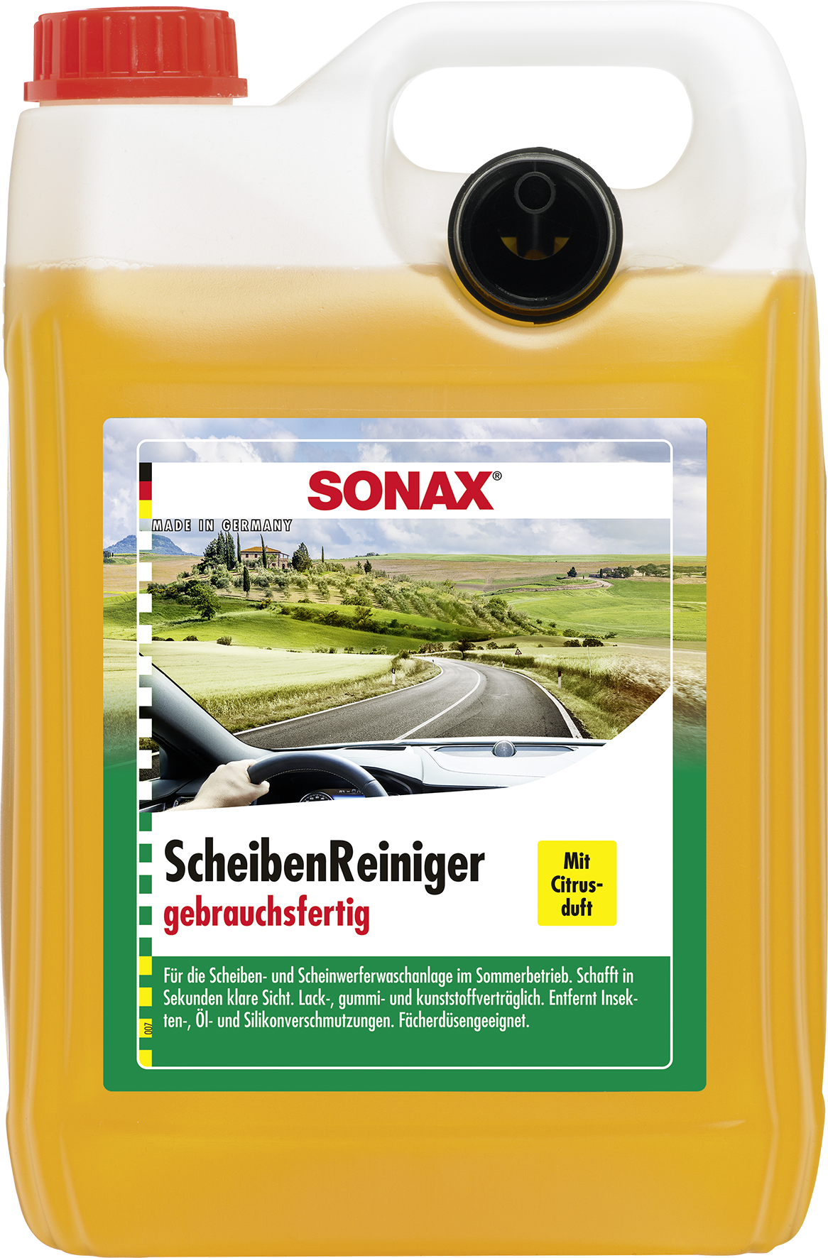 SONAX Vasaras vējstiklu šķidrums “Citrus” ar citrona aromātu. Ātri attīra no kukaiņiem, eļļas, sodrēju, silikona un citām traucējošām taukainām plēvēm no priekšējā stikla vai galvenajiem lukturiem. Neizraisa sprieguma plaisas uz priekšējiem lukturiem, kas izgatavoti no plastmasas. Ideāli piemērots augstas kvalitātes XENON galvenajiem lukturiem un gaismas izkliedējošiem plastmasas priekšējiem lukturiem ar skaidru stiklu. Bez fosfātiem. Lietošana: šķidrums ir gatavs lietošanai. Var lietot atšķaidītu ar ūdeni (sk. rekomendēciju uz iepakojuma).