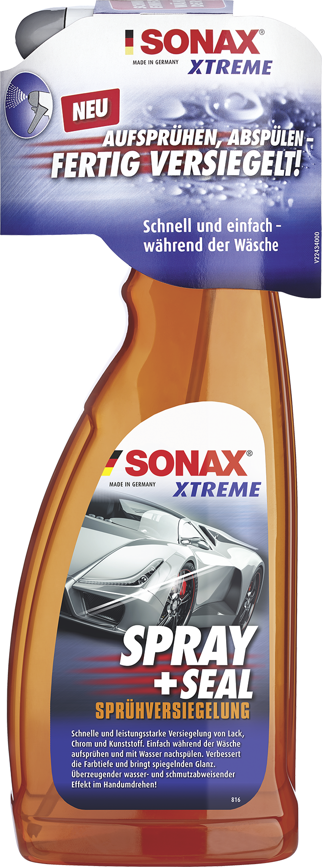 SONAX XTREME Krāsas pārklājums Spray & Seal. Viegli izmantojms transportlīdzekli var aizsargāt un padarīt netīrumu atgrūdošu dažu minūšu laikā automašīnas mazgāšanas laikā! Izsmidziniet uz šampūna vai pēc tam, noskalojiet un pārklāšanas darbs ir paveikts! Krāsotas virsmas krāsu dziļums tiek uzlabots un veidots spoguļa spīdums, īsā brīdī tiek radīts lielisks ūdens un netīrumu atgrūdošs efekts! Ir arī ideāli piemērots jau aizsargātiem krāsojumiem, lai atsvaidzinātu ūdeni atgrūdošo efektu.